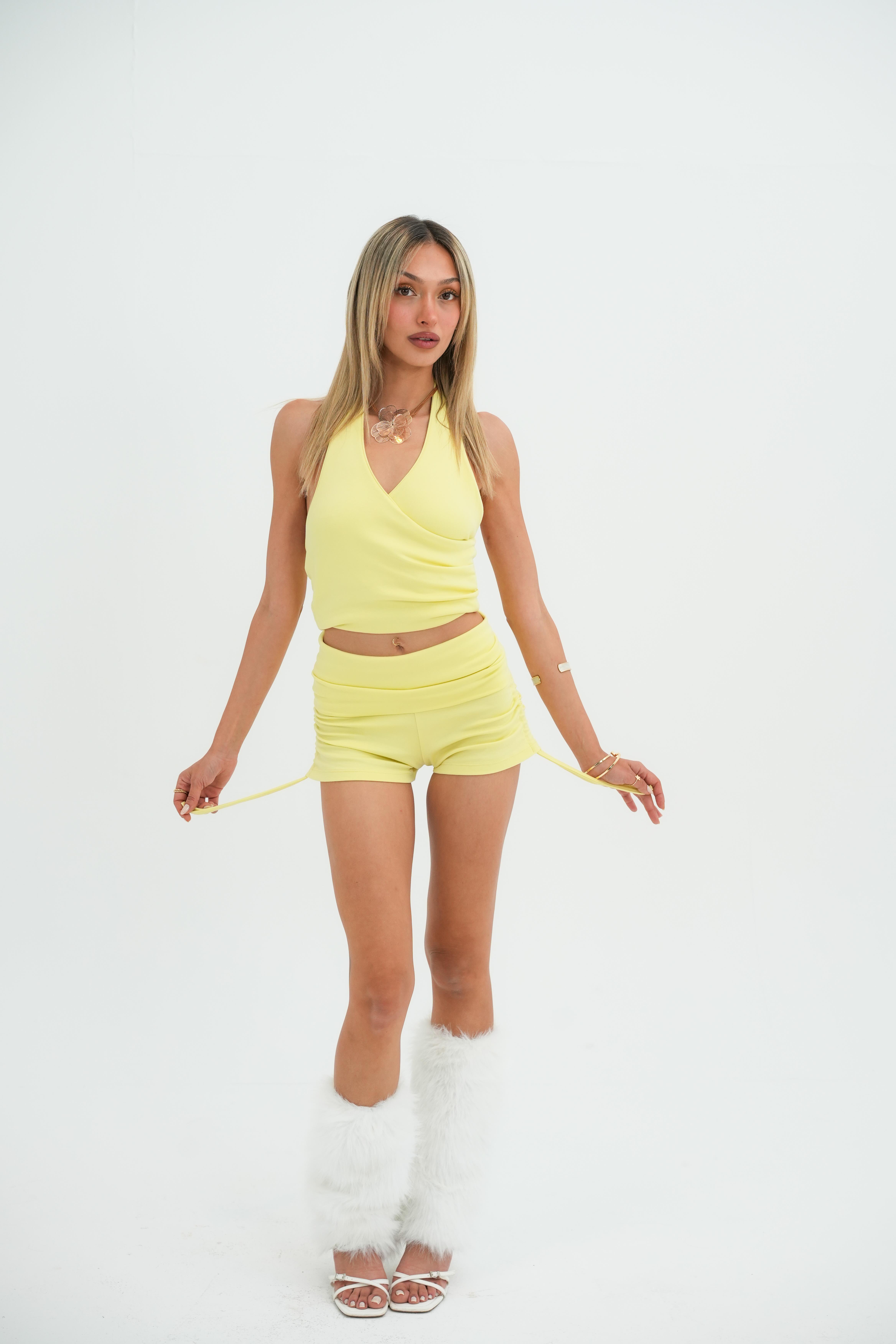 - Yanlardan büzgü ayarlı, bağcıklı mini şort .